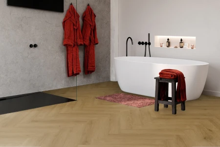 Elegancki akcent w łazience? Dla Parquetvinyl to żaden problem. Dzięki podłodze winylowej w jodełkę zmienisz codzienną rutynę w łazience w luksusową chwilę relaksu. Ciepłe i przyjemne uczucie pod stopami oraz eleganckie wykończenie podłogi? Mamy to.
